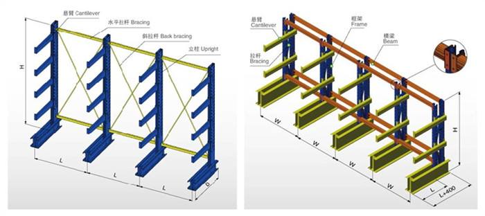 懸臂式貨架是由立柱、柱梁和懸臂組成。立柱采用自動預(yù)充孔軋制式雙拼C型專用型鋼作為立柱,以200、140工字鋼作為底梁,柱梁采用專用梯形板并用高強螺栓連接。懸臂梁為雙內(nèi)折邊C型對焊。懸臂梁與立柱用鍍鋅銷板連接。柱組間用連接件連接。(立柱多采用H型鋼或冷軋型鋼,懸臂采用方管、冷軋型鋼或H型鋼。懸臂與立柱間采用插接式或螺栓連接式,底座與立柱間采用螺栓連接式。)單臂承重可達1000kg以上,特別加固的立柱結(jié)構(gòu),可以承受2000~3000kg壓力。組合式結(jié)構(gòu),專用型材立柱,設(shè)計背拉增加穩(wěn)定型,配高強度懸臂(臂可以為單面或雙面),具有結(jié)構(gòu)輕巧、載重能力好、空間利用率高等特點。 懸臂貨架優(yōu)點